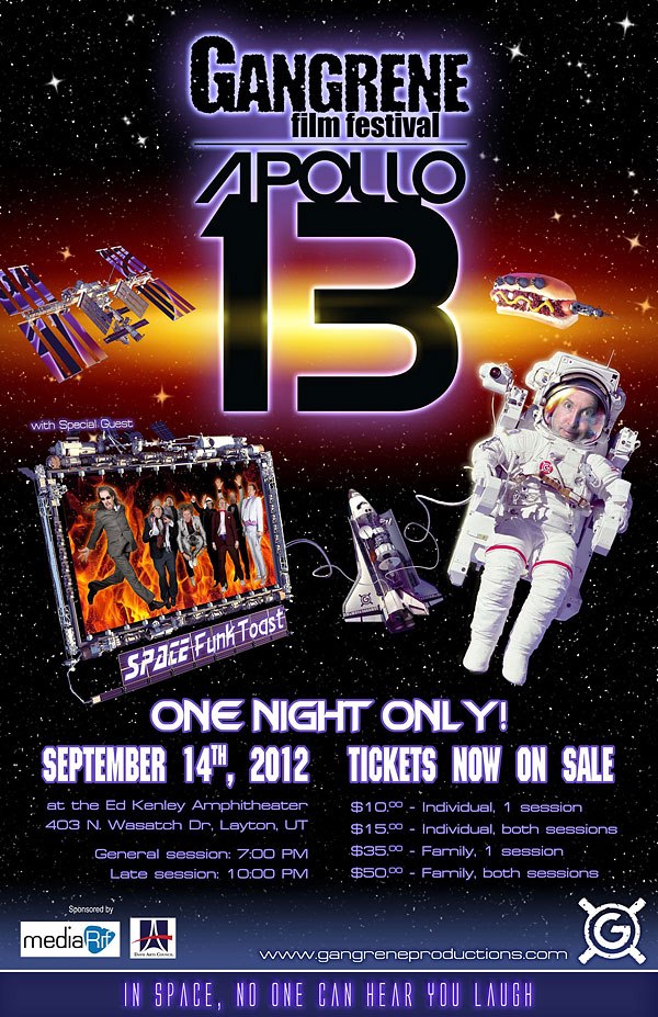 It is time once again for me to do a quick personal plug for our annual Comedy Short Film Festival (www.gangreneproductions.com & www.facebook.com/gangrenefilmfestival). It is less than a week away (at the Ed Kenley Amphitheater in Layton, Utah on Friday, September 14th) and I would like to encourage you to attend for a multitude of reasons (several of which I have bullet-pointed the last couple of years on Blogmaster2000.com and on Facebook and will now copy and paste and update where necessary):